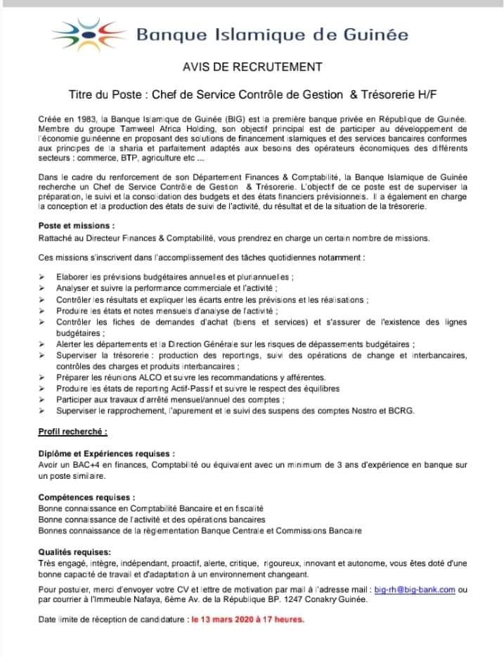 La Banque Islamique de Guinée recherche un Chef de service Contrôle de gestion et Trésorerie H/F