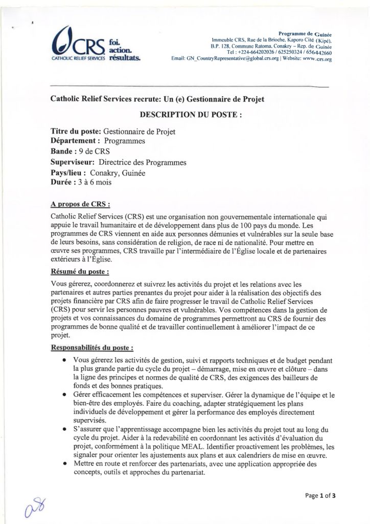 L’ONG CRS – recrute un(e) Gestionnaire de Projet