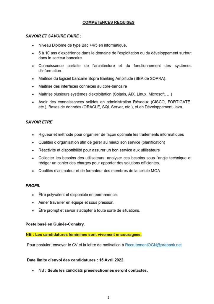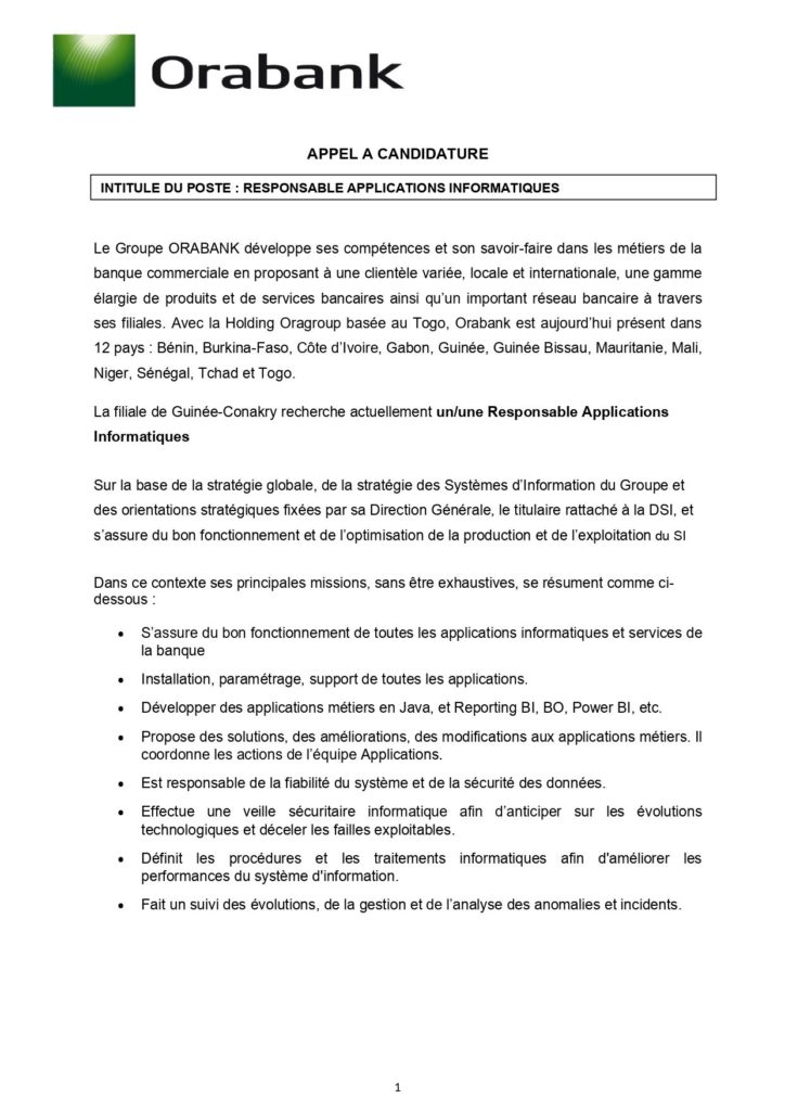 ORABANK GUINÉE RECRUTE UN(E) RESPONSABLE APPLICATIONS INFORMATIQUES