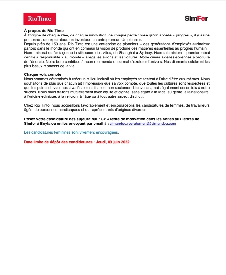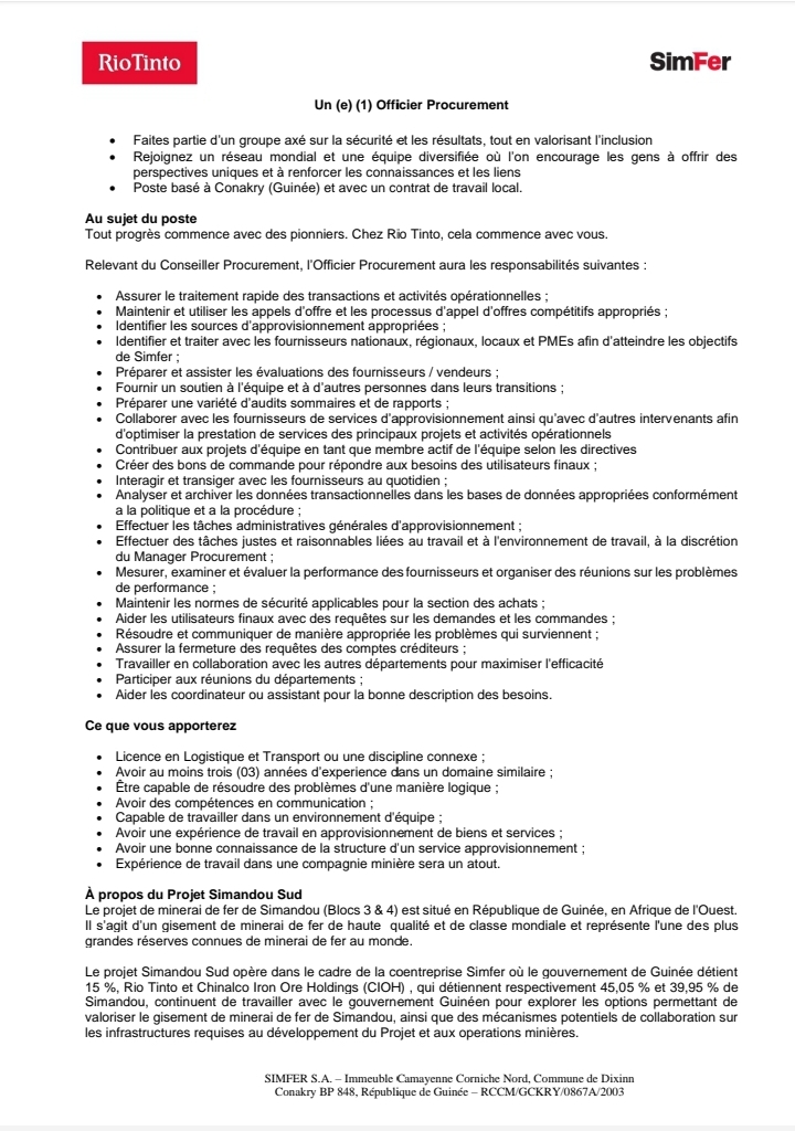 RIO TINTO recrute un(e) (01) Officier Procurement