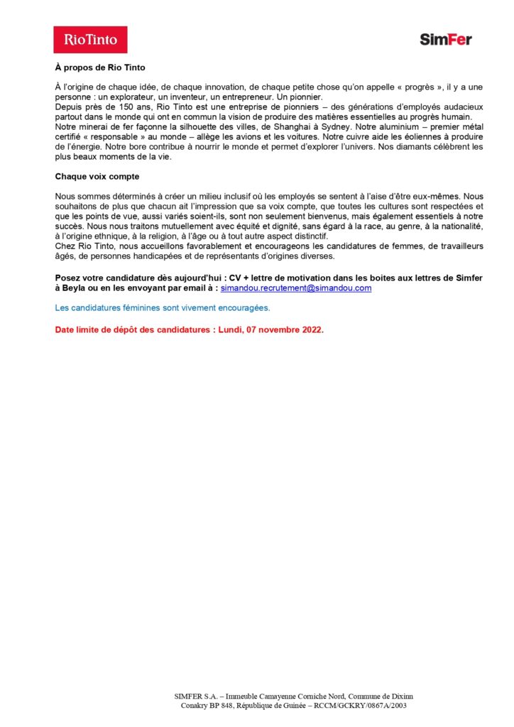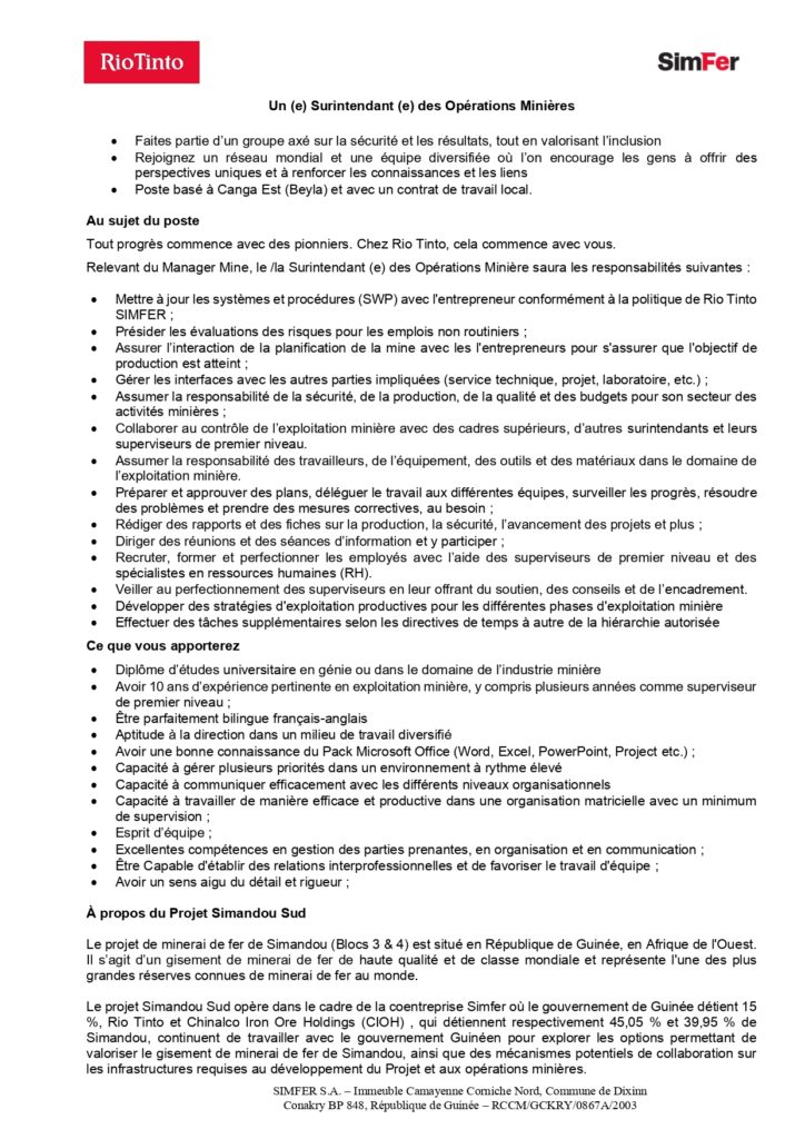 Rio Tinto recrute Un(e) Surintendant(e) des Opérations Minières