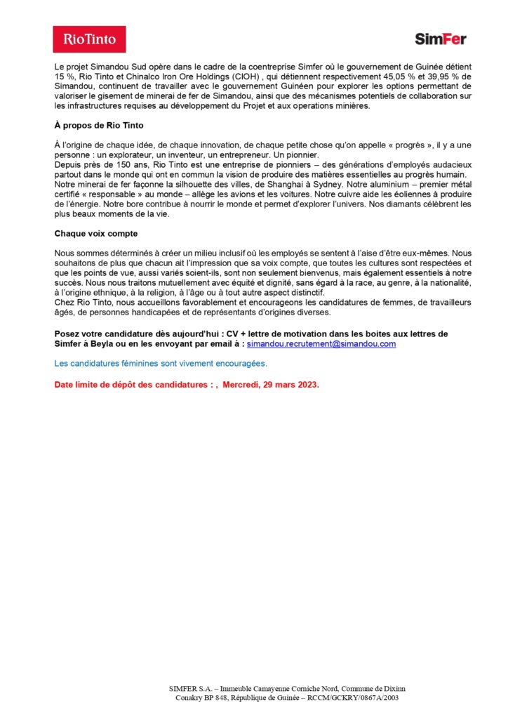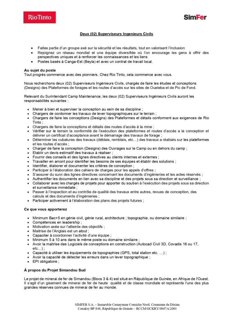 RIO TINTO recrute deux(02) Superviseurs Ingénieurs Civils